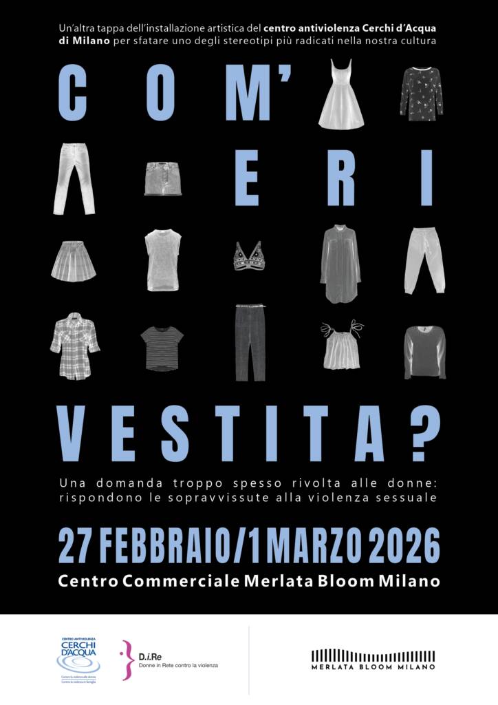 - “Com’eri vestita?” – Rispondono le sopravvissute alla violenza sessuale”, la mostra realizzata dal Centro Antiviolenza Cerchi d’Acqua e presentata per la prima volta nel marzo 2018, ha avuto una sua tappa a Milano presso il Centro Commerciale Merlata Bloom Milano dal 27 al 1 marzo 2026.