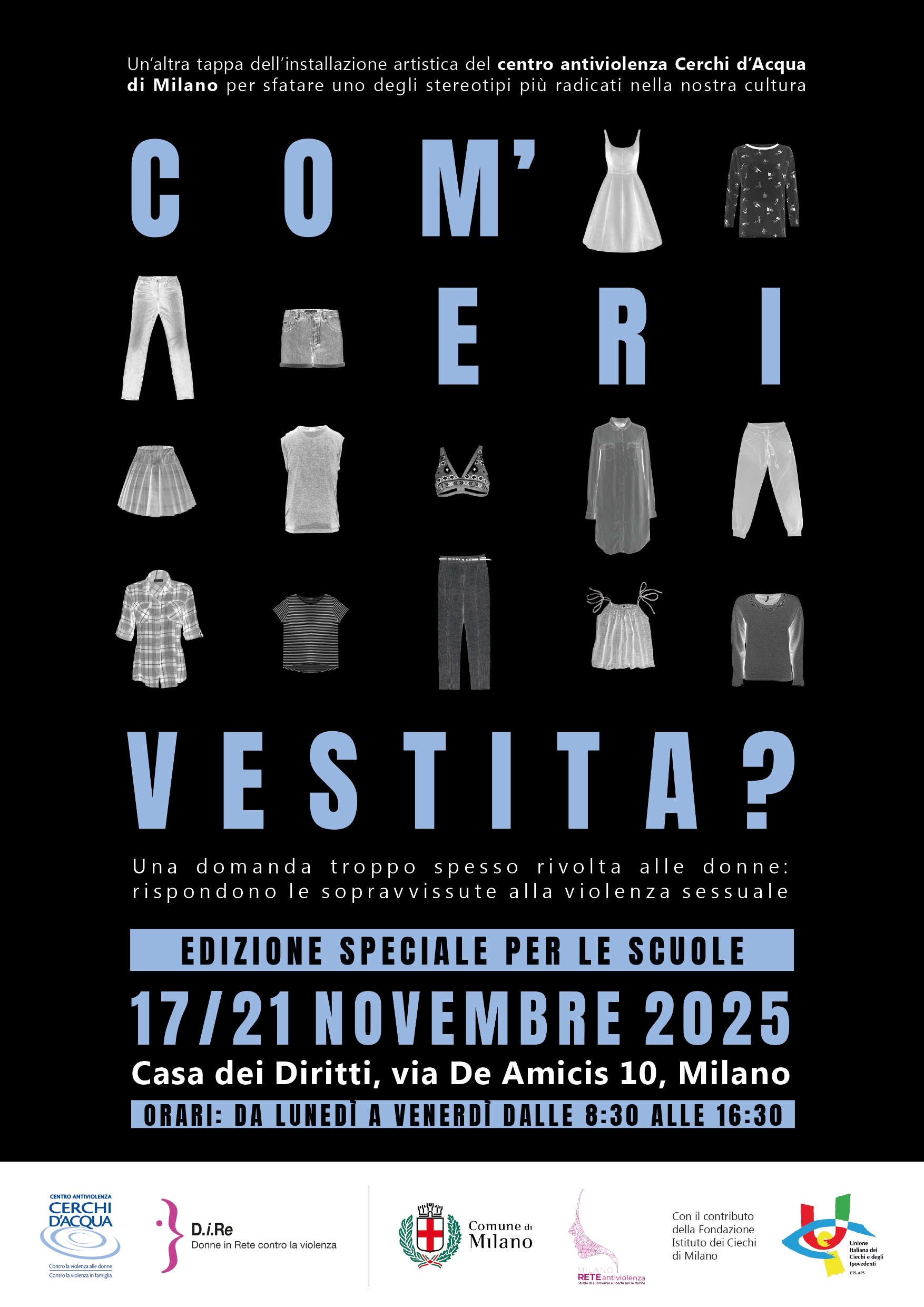 - Dal 17 al 21 NOVEMBRE 2025, sarà allestita la mostra “COM’ERI VESTITA?” alla Casa dei Diritti a Milano. Edizione speciale per le Scuole