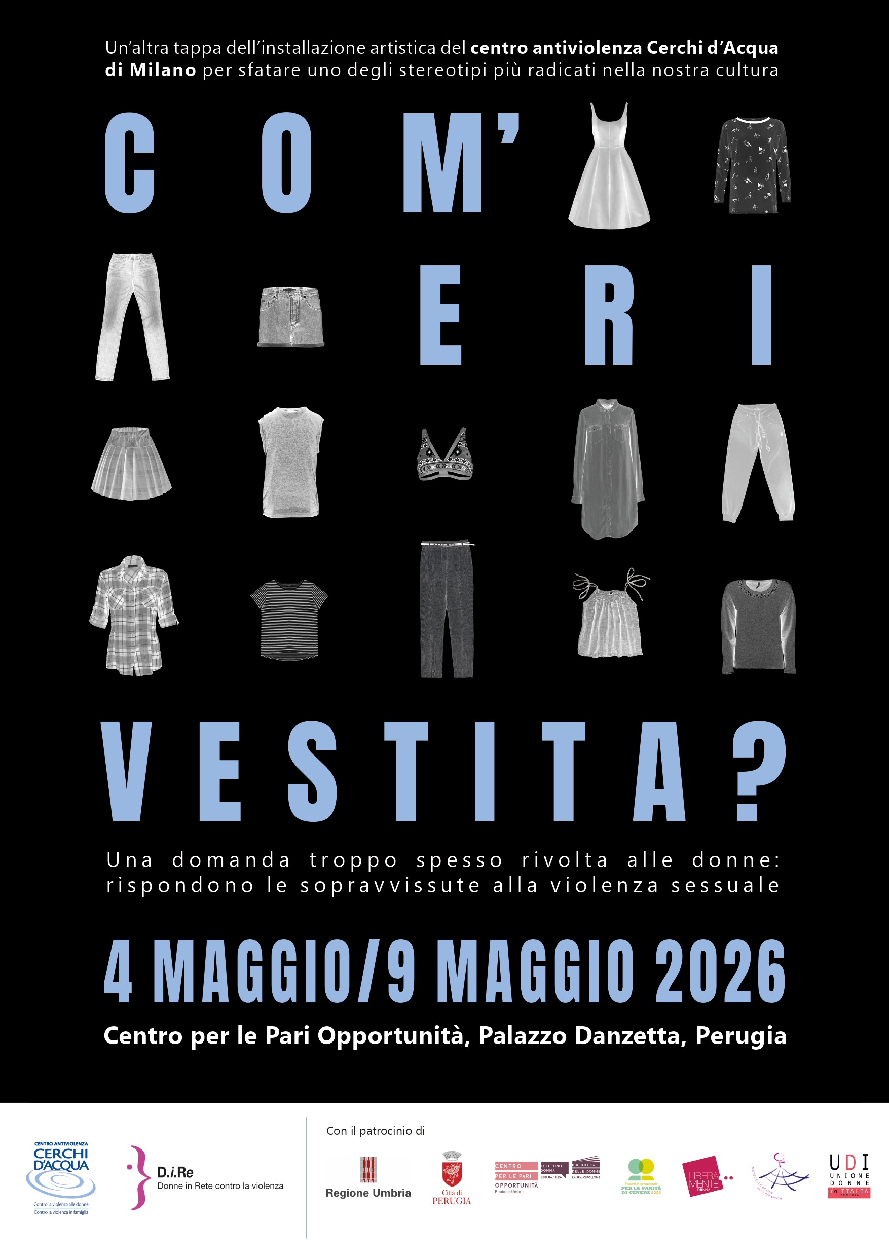 “Com’eri vestita? Rispondono le sopravvissute alla violenza sessuale”, la mostra realizzata dal Centro Antiviolenza Cerchi d’Acqua e presentata per la prima volta nel marzo 2018, ha una nuova tappa a Perugia dal 4 al 9 maggio 2026.