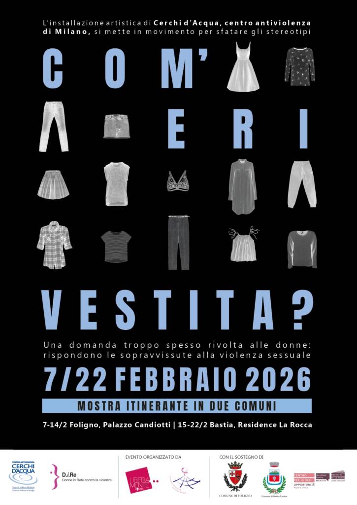“Com’eri vestita?” – Rispondono le sopravvissute alla violenza sessuale”, la mostra realizzata dal Centro Antiviolenza Cerchi d’Acqua e presentata per la prima volta nel marzo 2018, ha una doppia tappa in due comuni umbri, Foligno e Bastia